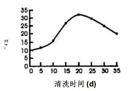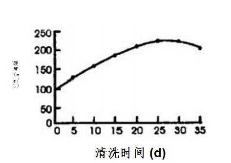 圖2、圖3顯示的水垢清洗過程中循環(huán)水濁度和硬度變化趨勢說明,加人GR-943后,濁度和硬度都開始增加,但增加趨勢略有差異。濁度在GR-943加入10d后快速增加,20d時(shí)達(dá)到大值32mg/L,25d后又開始快速下降。硬度在GR-943加入后呈線形增加趨勢,20d后增幅趨緩,26d時(shí)達(dá)到大值217mg/L,26d后呈緩慢下降趨勢,除垢過程趨于終點(diǎn)。