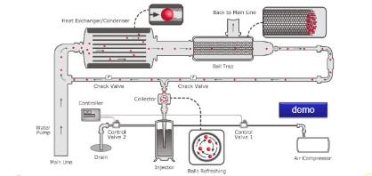 2、在設(shè)定固定頻率后,膠球被一次送入凝汽機(jī)(熱交換)系統(tǒng),并且散開(kāi)進(jìn)入所以管道進(jìn)行清洗。