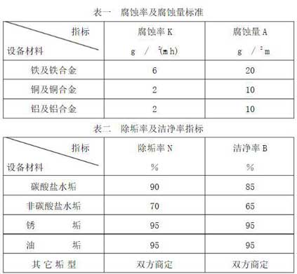 清洗質(zhì)量符合HG/T2387-92《工業(yè)設(shè)備化學(xué)清洗質(zhì)量標(biāo)準(zhǔn)》,即對(duì)設(shè)備材料的腐蝕率和腐蝕量其指標(biāo)應(yīng)不大于表一的規(guī)定;設(shè)備除垢率和洗凈率應(yīng)不小于表二的規(guī)定。本次清洗,質(zhì)量優(yōu)于該標(biāo)準(zhǔn)。