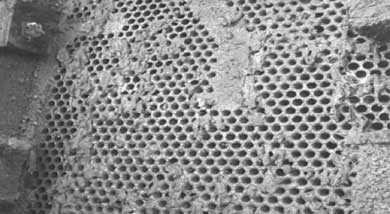 1)蒸發(fā)器前7效(尤其第1效)上部銅管表面附著有一層均勻的水垢沉積物,見圖1,厚度約0.5mm,底部銅管表面附著一層較厚的硬質(zhì)水垢沉積物,部分區(qū)域形成水垢掛體并塞滿換熱管縫隙,不銹鋼內(nèi)壁附著一層水垢掛體,部分區(qū)域厚度達(dá)到10mm,垢樣分析主要成分為硫酸鈣,并有部分碳酸鈣;