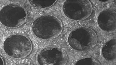 2)末效鈦管內(nèi)有薄薄的一層水垢沉積物,并有黏泥雜質(zhì)形成的沉積物,以及藻類、貝類等雜物,垢樣分析主要成分為碳酸鈣,見圖2。