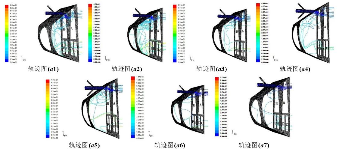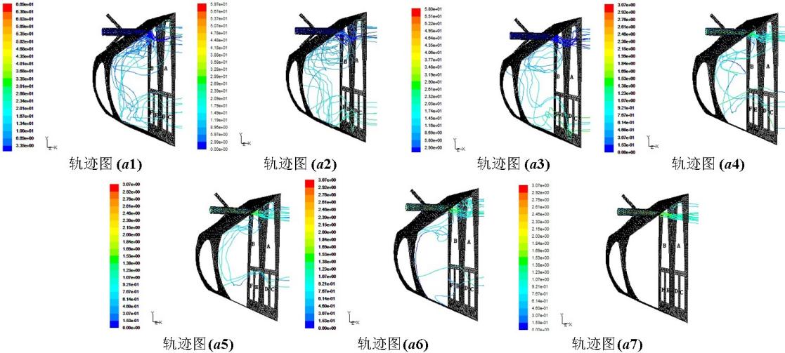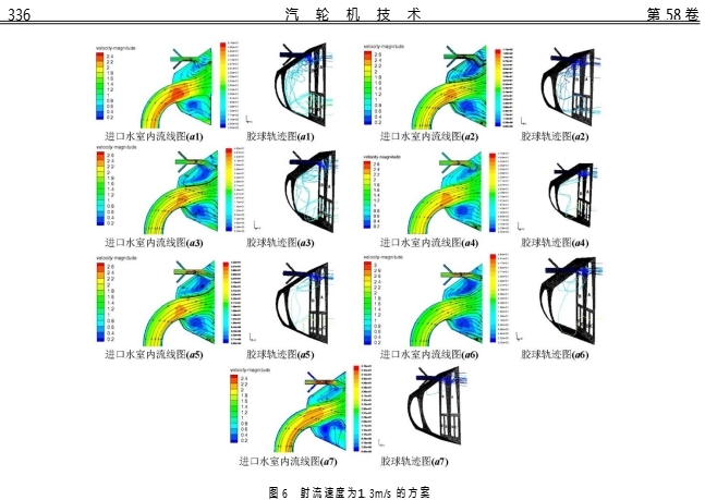1m/s,a1表示射流速度U=1.3m/s、膠球速度V=1m/s。射流速度為1.3m/s時(shí)結(jié)果分析圖6表示對A區(qū)域上部分冷卻管束進(jìn)行清洗,射流速度為1.3m/s時(shí),送球速度分別為1.0m/s、1.2m/s、1.4m/s、1.6m/s、1.8m/s、2.0m/s、2.2m/s,進(jìn)口水室內(nèi)的流線圖和膠球軌跡圖。對膠球通過A、B、C、D、E、F6個(gè)區(qū)域的情況進(jìn)行統(tǒng)計(jì),結(jié)果見表1。