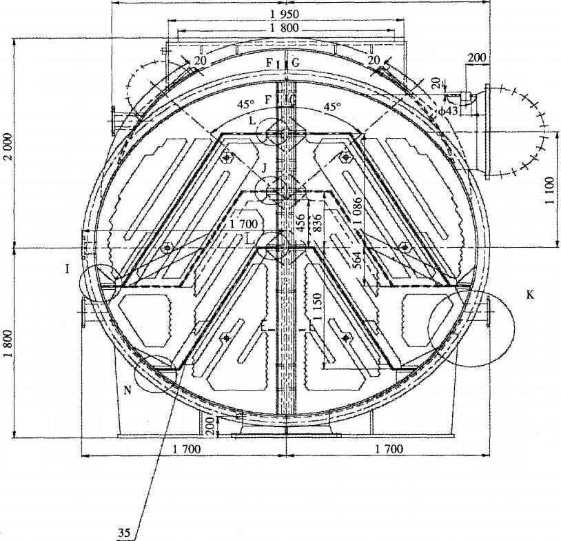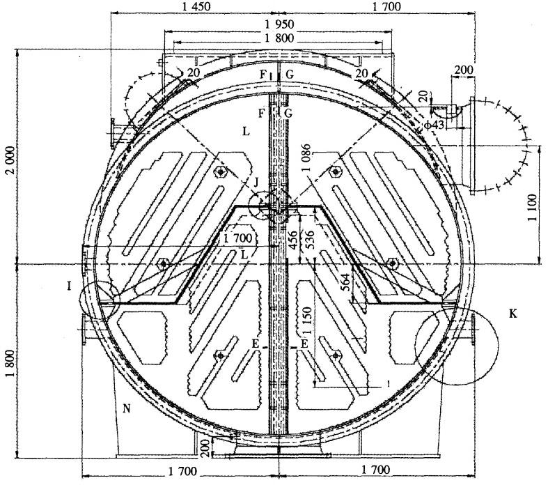 圖1小機(jī)凝汽器水室隔板改造前示意圖(單位:mm)進(jìn)行調(diào)研分析。通過(guò)現(xiàn)場(chǎng)檢查,認(rèn)為造成收球率較低的主要原因有以下幾點(diǎn):