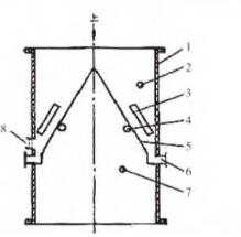 圖4改造后的A形雙箭式收球網(wǎng)縱剖面結(jié)構(gòu)注:1捕環(huán)水管管壁;2網(wǎng)前測壓點(diǎn);3導(dǎo)流.板.;4軸;5網(wǎng)板;6脫球引出管;7網(wǎng)后測驗(yàn)點(diǎn);8觀寨孔